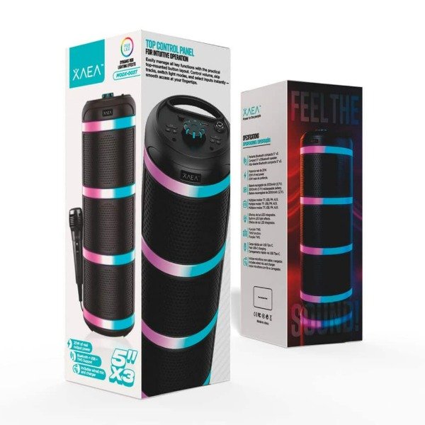 Incluye cable de carga y micrófono con cable para karaoke o presentaciones.